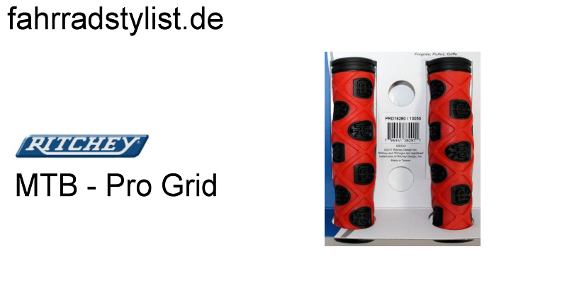 Beschreibung Dual Compound Kraton Gummi, rutschsicher durch rautenförmige Profilierung, ergonomisch im Design, mit auffälligen Ritchey Logos Ritchey, Griffe MTB PRO GRID, schwarz, rot, 127 mm, Dual Density, offenes Ende mit Stopfen, mit Verpackung, NEUES PRODUKT 2012, HstNr: 38-226-733 |