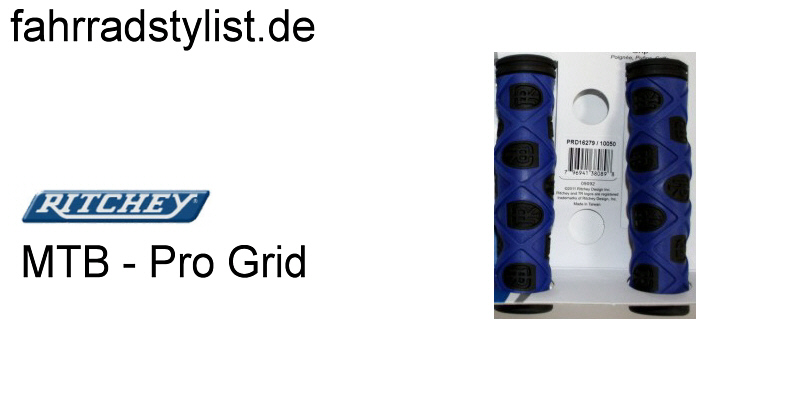 Beschreibung Dual Compound Kraton Gummi, rutschsicher durch rautenförmige Profilierung, ergonomisch im Design, mit auffälligen Ritchey Logos Ritchey, Griffe MTB PRO GRID, schwarz,blau, 127 mm, Kraton, offenes Ende mit Stopfen, mit Verpackung, NEUES PRODUKT 2012, HstNr: 38-226-731 |