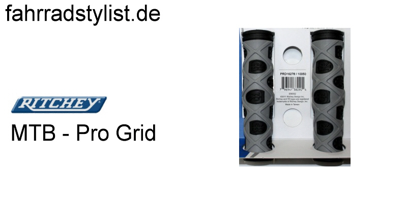 Beschreibung Dual Compound Kraton Gummi, rutschsicher durch rautenförmige Profilierung, ergonomisch im Design, mit auffälligen Ritchey Logos Ritchey, Griffe MTB PRO GRID, schwarz,Grey, 127 mm, Dual Density, offenes Ende mit Stopfen, mit Verpackung, NEUES PRODUKT 2012, HstNr: 38-226-732 |