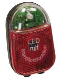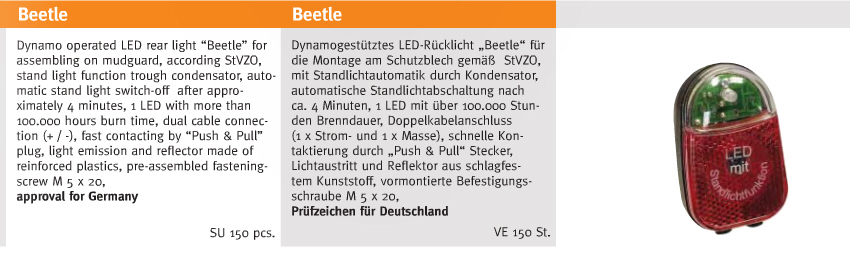 50109210 - 50080 - K 498 - EAN 400050080010 Dynamogestütztes LED-Rücklicht "Beetle" für die Montage am Schutzblech gemäß StVZO, mit Standlichtautomatik duch Kondensator, automatische Standlichtabschaltung nach ca. 4 Minuten, 1 LED mit über 100.000 Stunden Brenndauer, Doppelkabelanschluss (1 x Strom- und 1 x Masse), schnelle Kontaktierung durch "Push & Pull" Stecker, Lichtaustritt und Reflektro aus schlagfestem Kunststoff, vormontierte Befestigungsschraube M5 x 20, mit Prüfzeichen für Deutschland