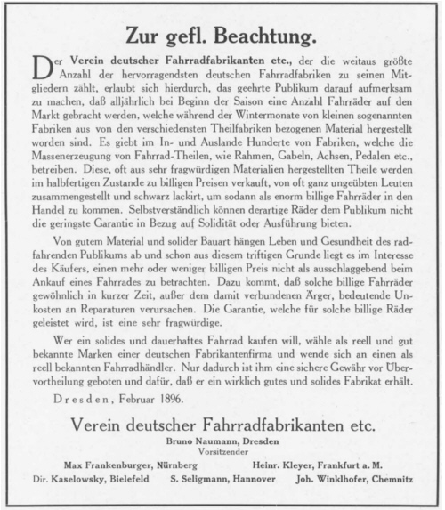 Links: Informationen zum Thema Fahrradschichte, zu Sammlerseiten und LiebhabernLiteratur: http://www.antiquar.de/html/kathd1907-fahrrad-radfahren.html PrüfzeichenEinführung der Prüfzeichen Kraftfahrtbundesamt (KBA) Bestimmung von unbekannten FahrrädernRahmenbauZitat: "Die Fahrradindustrie war mal sehr stolz auf das fortschrittliche Abbrennstumpfschweißen des Ausfallendes an plattgedrückte Hinterbaurohre, auf pressgeschweißte Schlosshalter und Pletscherplatten. Ich meine das war wohl in der zweiten Hälfte der Sechziger, da könnte das Rad auch entstanden sein. ..." Quelle mit Foto http://www.altesrad.net/phpBB3/viewtopic.php?f=2&t=3996&p=32308#p32308 typische ? Beispiele entsprechend des Zeitraumeshttp://www.altesrad.net/phpBB3/viewtopic.php?f=2&t=1717 (Gepäckträgertyp, Lampe auf dem Schutzblech vorn, verchromte Schutzblechstreben, http://www.zbsport.de/Schriftenreihe/Band-07.html Franz, Renate (2007): Fredy Budzinski Radsport-Journalist, Sammler und Chronist. Schriftenreihe der Zentralbibliothek der Sportwissenschaften der Deutschen Sporthochschule Köln, Band 7. SPORTVERLAG Strauß, Köln. ISBN 978-3-939390-43-5 Zitat: " ... Zu Lebzeiten wurde Fredy Budzinski (1879-1970) in deutschen Radsportkreisen ''Nestor des deutschen Radsports” genannt. Sein eigentlicher Beruf war Journalist, aber seine Tätigkeiten und Verdienste für den Radsport anhand dieser Bezeichnung zu umschreiben, würde ihm nicht gerecht werden. Er war in seiner Jugend selbst Rennfahrer, schrieb zahlreiche Bücher und Gedichte zum Thema, war Funktionär, Erfinder, Lobbyist, Organisator und Sammler. Der Radsport in all seinen Facetten war sein Lebensinhalt. Bücher und Zeitschriftenbestände wurden in den allgemeinen Bestand der Zentralbibliothek der Deutschen Sporthochschule übernommen. Besonders die Zeitschriften, viele Bände aus den Jahren vor dem Ersten Weltkrieg, bilden heute einen im deutschsprachigen Raum einmaligen Schatz für Radsport- und Fahrrad-Historiker. Quelle: BESTANDSVERZEICHNIS DES ARCHIVS FREDY BUDZINSKI http://esport.dshs-koeln.de/109/1/CD_Inhalt_Archiv_Budzinski_Bestandsverzeichnis_Findbuch.pdf Presse, Kataloge,http://www.waffenrad.at/datenregister.htm ForschungsDienst Fahrrad Zitat: "Auf den folgenden Seiten finden Sie Alltagsfahrräder aus der Wirtschaftswunderzeit und ihre Geschichten und eine kommentierte Link- und Literaturseite mit Tipps für alle, die sich für historische Fahrräder interessieren." Festschrift zum 40jährigen Jubiläum des "Verein Deutscher Fahrradindustrieller e. v."http://www.digitalis.uni-koeln.de/Fahrrad/fahrrad_index.html 1888- 1928 - 40 Jahre Inhalt: