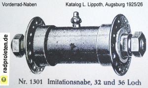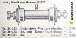 Naben - AltersbestimmungSchriftzug auf einer Vorderradnabe eines Miele-Fahrrades (vermutlich 1938) Vorderradnabe "Imitationsnabe" Vorderrad-Nabe "Präzisions-Vorderradnabe" (noname) |