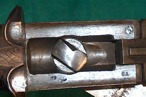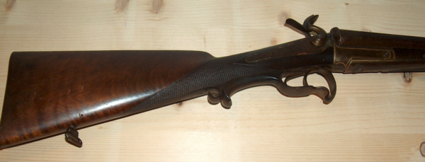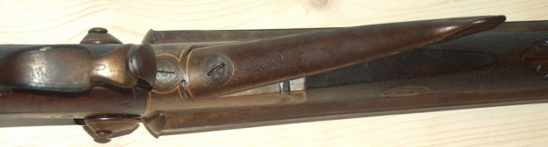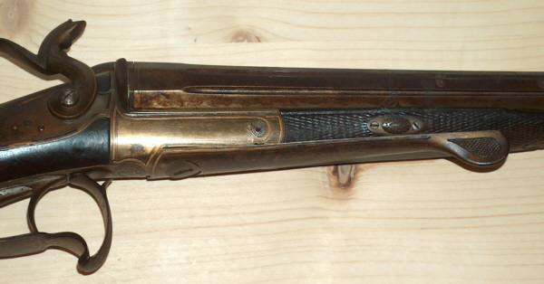 Kipplaufwaffe mit außenliegenden Hähnen und Laufhakenverriegelung (?),