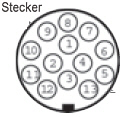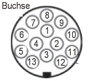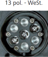 Wohnwagen / Caravaning - ElektrikWeSt (Multicon)Steckerbelegungsplan Multicon West Nummer / Farbe / Anschlußstecker-Funktion1 / gelb / Blinker links 2 / blau / Nebelschlussleuchte 3 / weiß / Masse für Kontakt 1-8 4 / grün / Blinker rechts 5 / braun / Licht rechts 6 / rot / Bremsleuchten 7 / schwarz / Licht links 8 / grau / Rückfahrleuchte 9 / - / Dauerstrom (Dauerplus) 10 / - / Ladeleitung 11 / - / frei 12 / - / frei 13 / - / Masse für Kontakt 9-12 Abbildungen entsprechen -> auf die Pins am Stecker geschaut Abbildung auf die Buchse Belegungsplan für 7-pol.-, 13-pol.- und Multicon- Stecker und Steckdosen nach DIN/ISO 11446